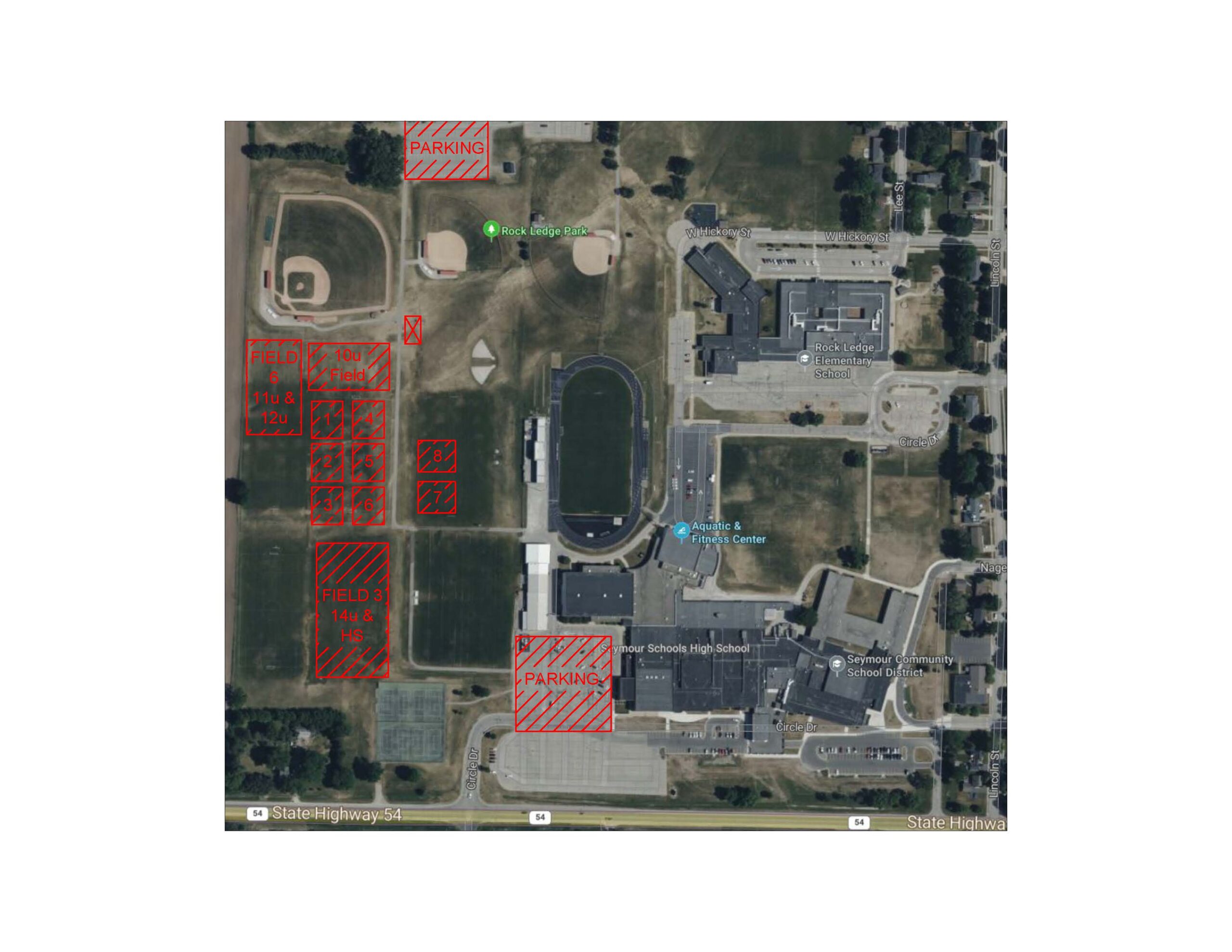 Use 615 High St, Seymour, WI 54165 for GPS directions to Rock Ledge Park for Parking. There is a path you can use from the Southwest parking lot to the fields (located behind the ball diamond).